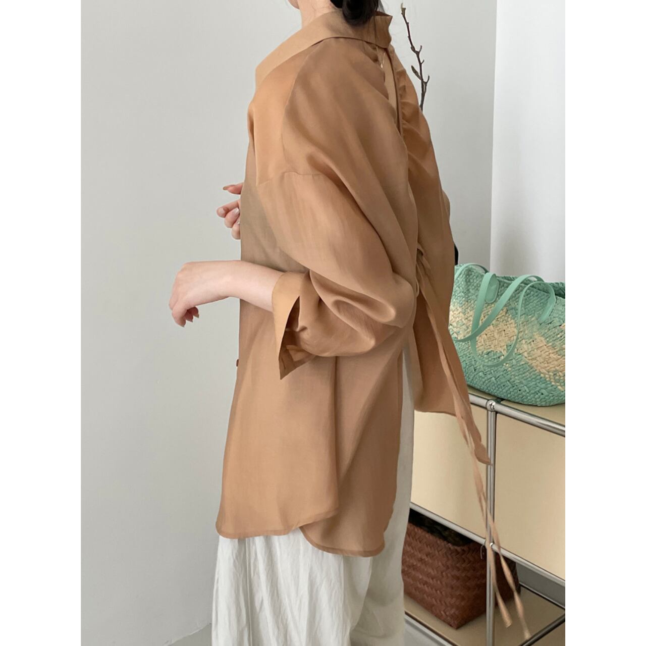 バックオープンリボンタイシアーシャツ a0455