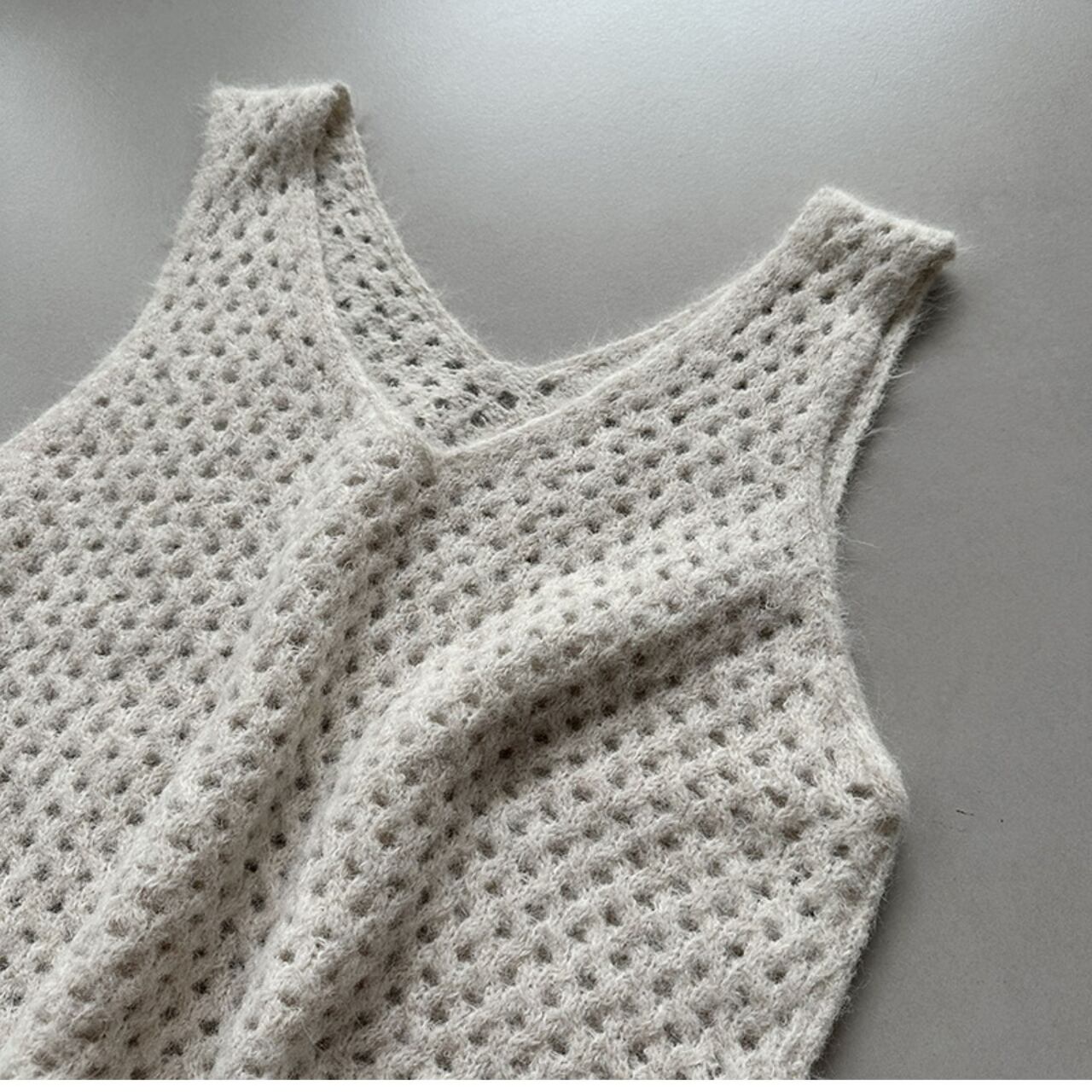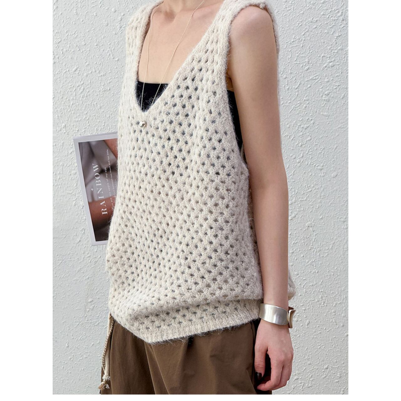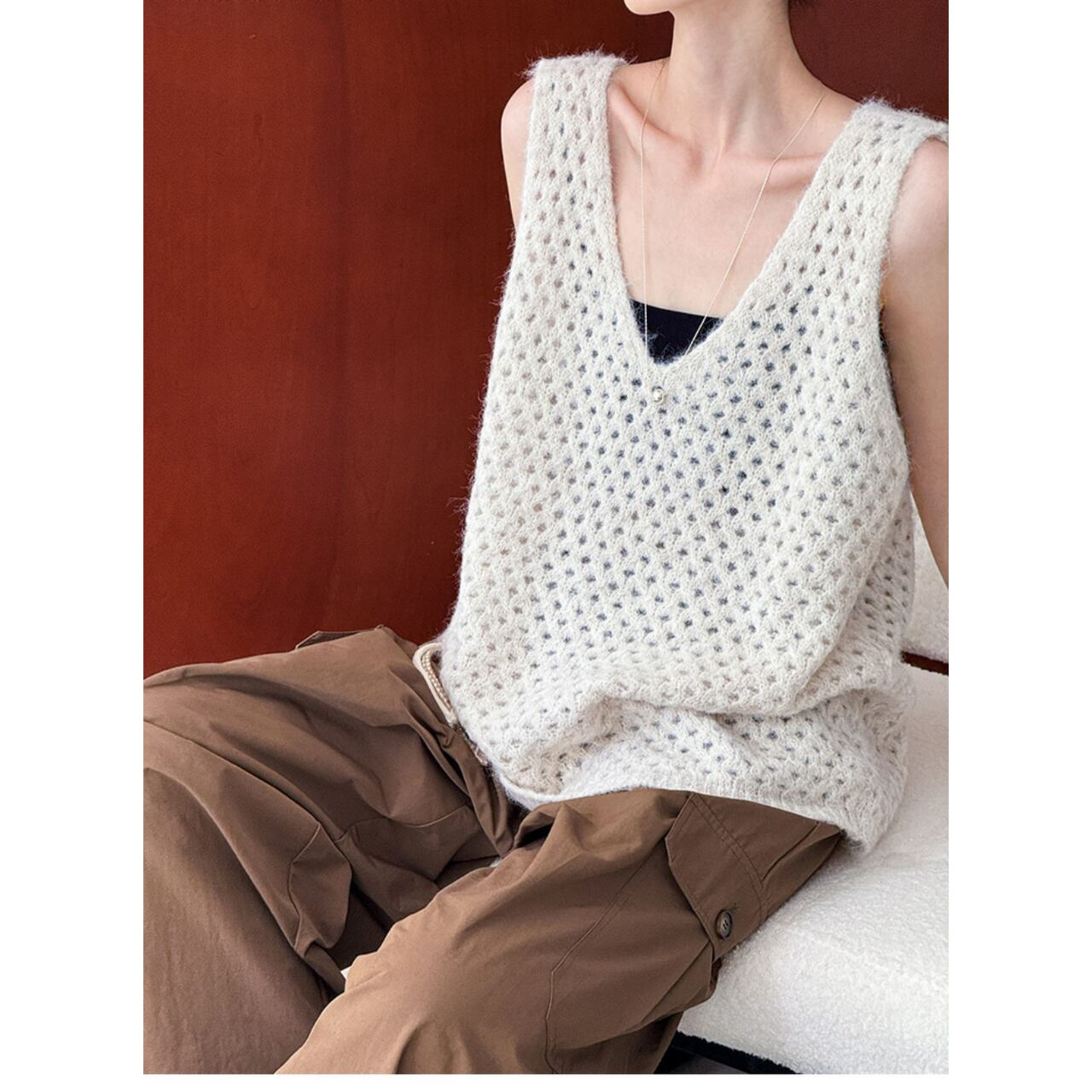 Vネックと透かし編みの組み合わせが魅力のノースリーブニット。タンクトップはもちろん、シャツやブラウスを重ね着して様々なレイヤードを楽しめます。