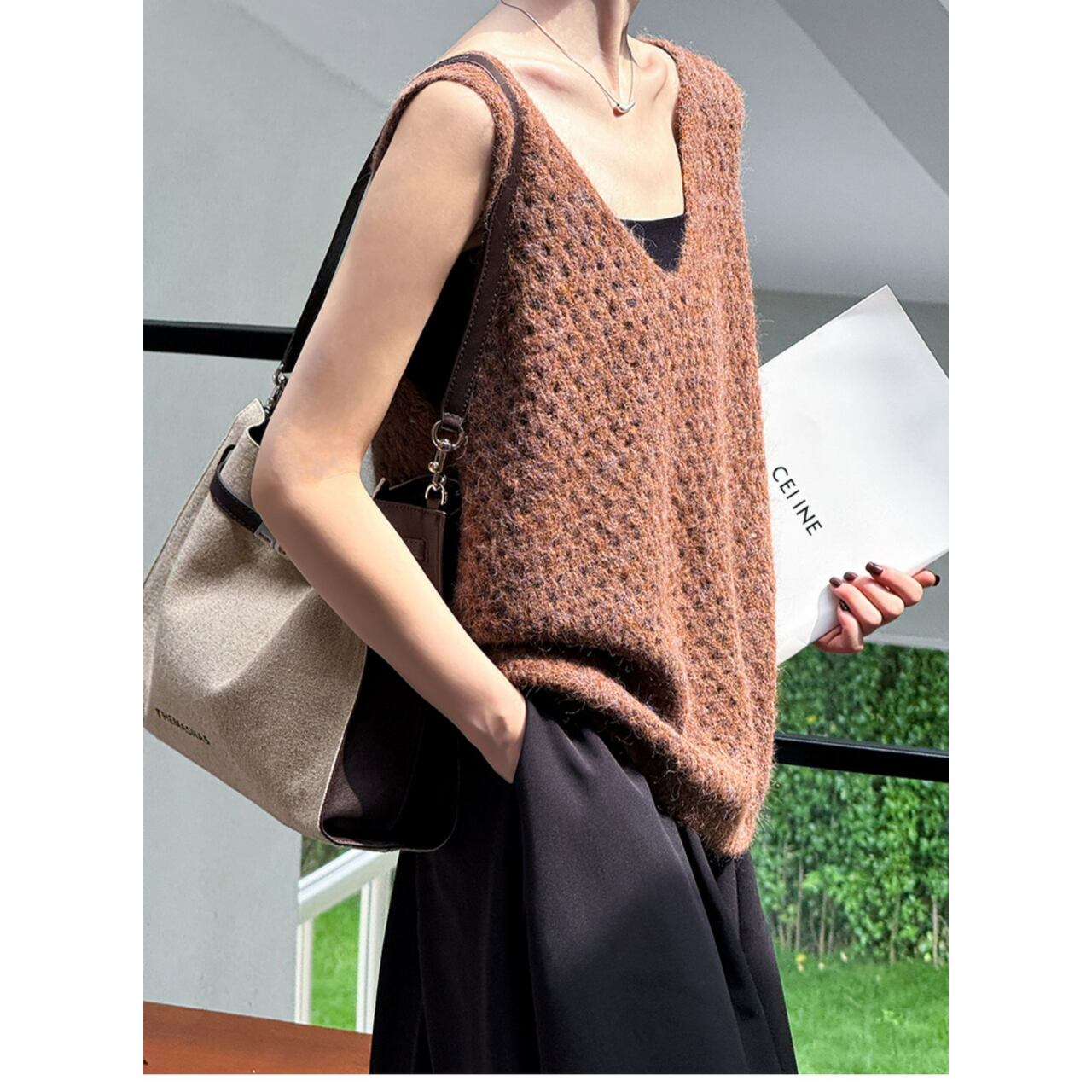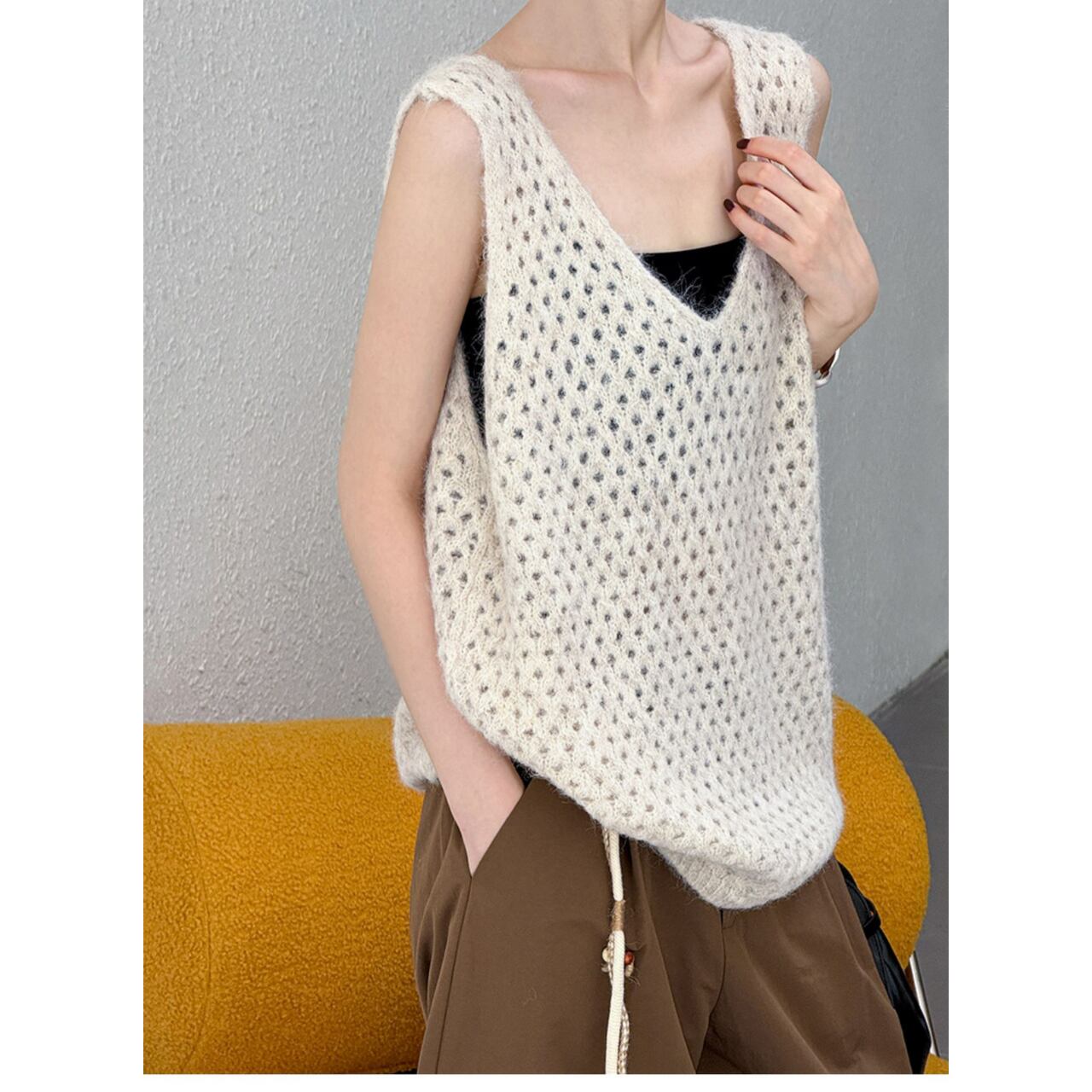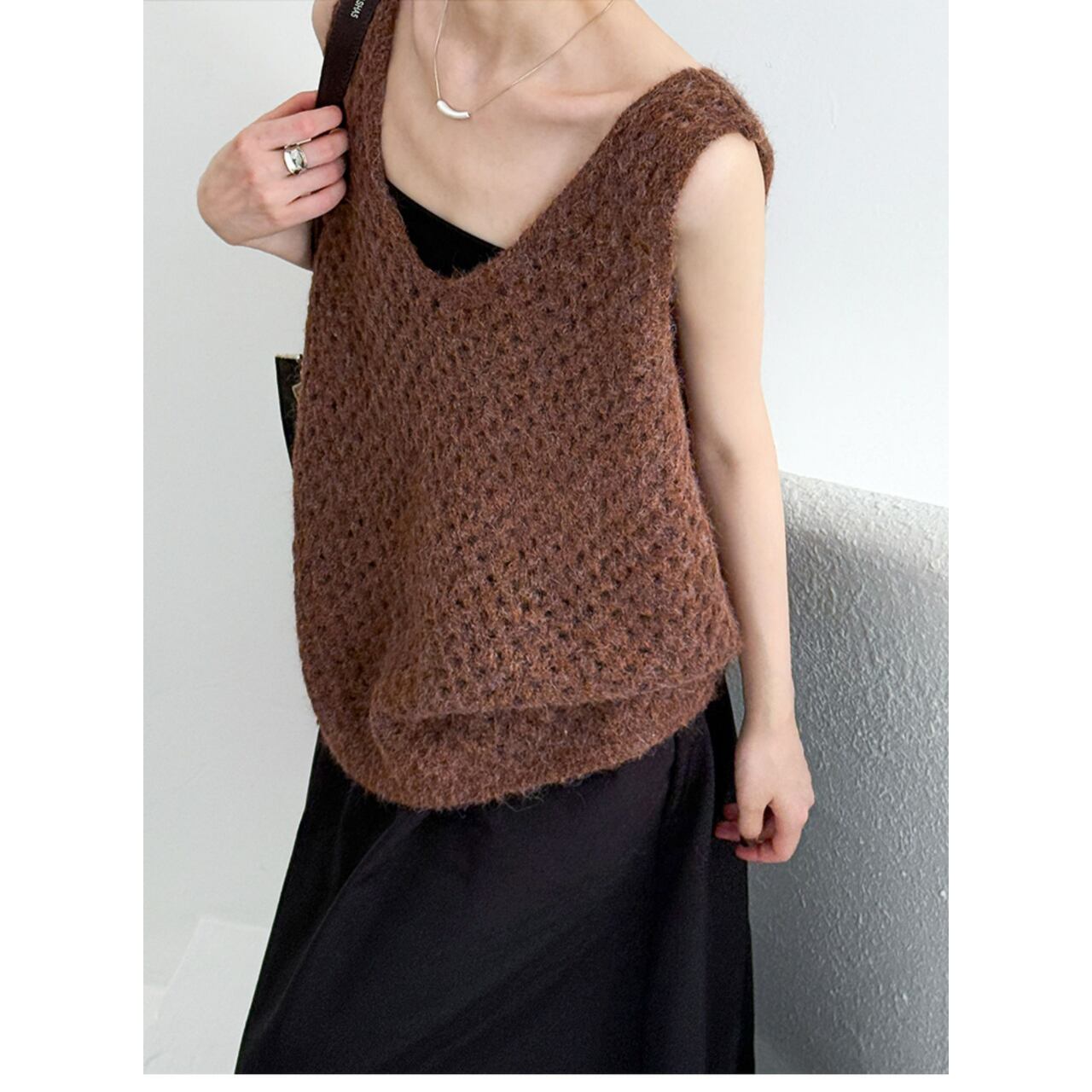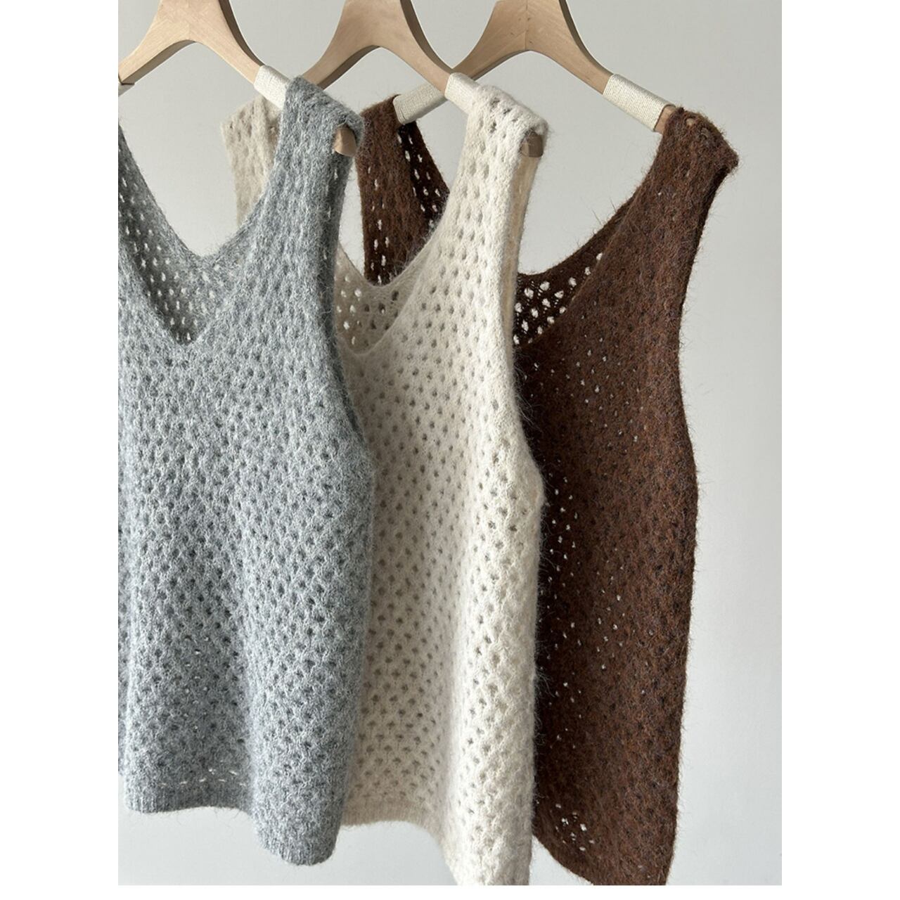 Vネックと透かし編みの組み合わせが魅力のノースリーブニット。タンクトップはもちろん、シャツやブラウスを重ね着して様々なレイヤードを楽しめます。