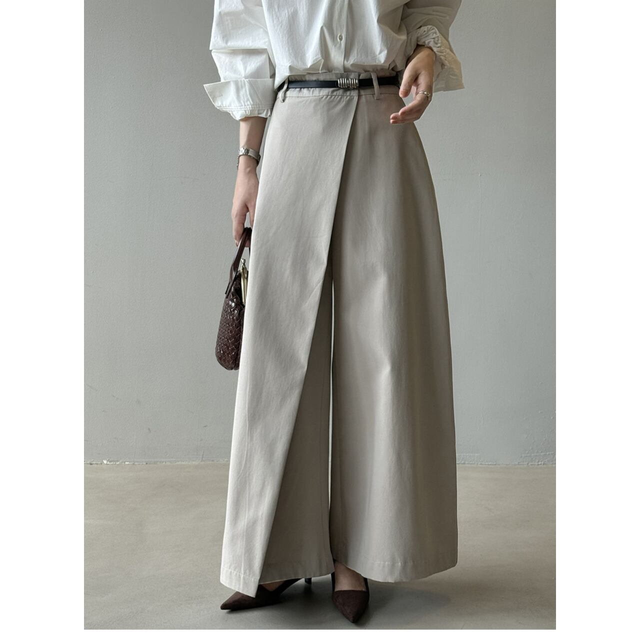 ラップデザインが洗練された印象を与えるハイウエストワイドパンツ。