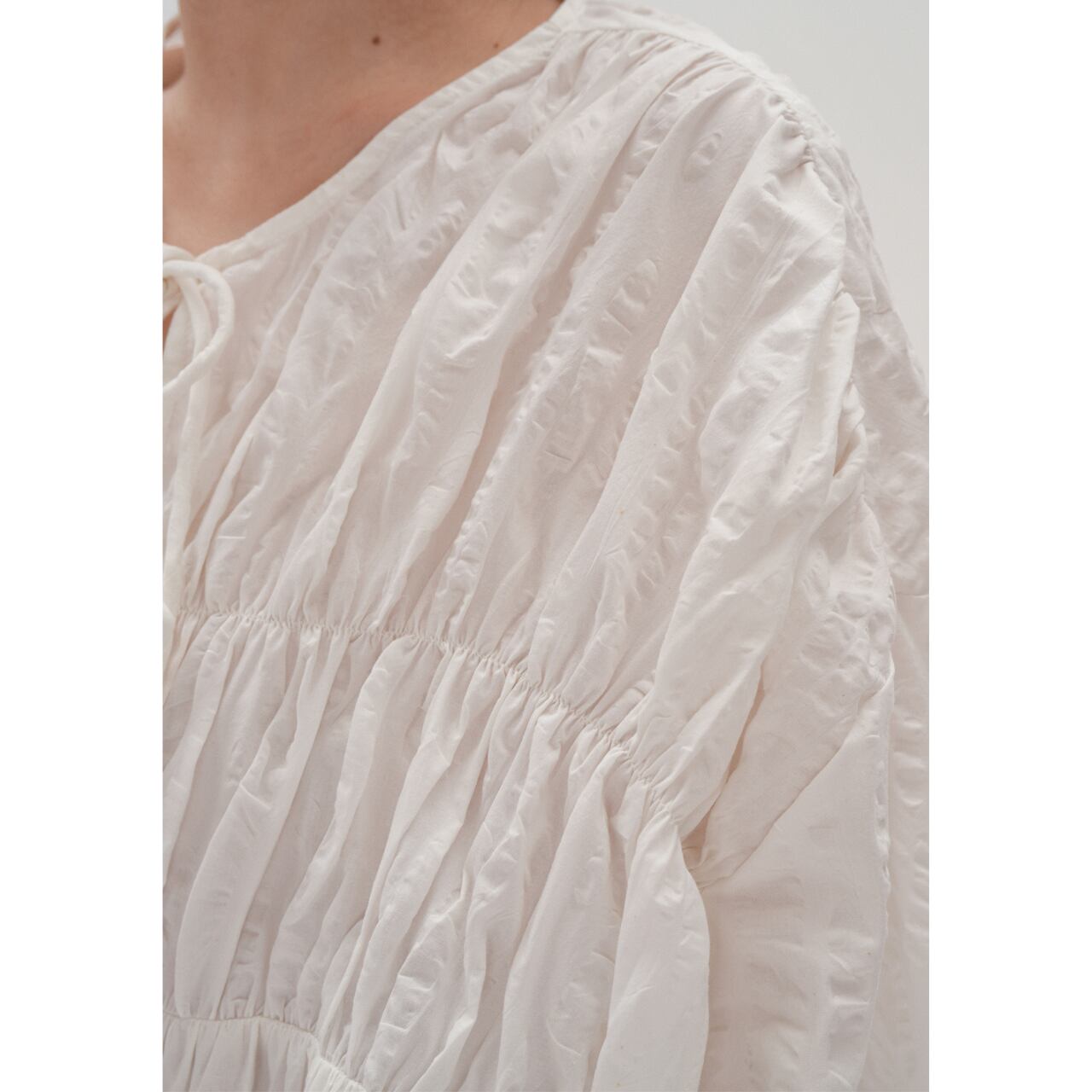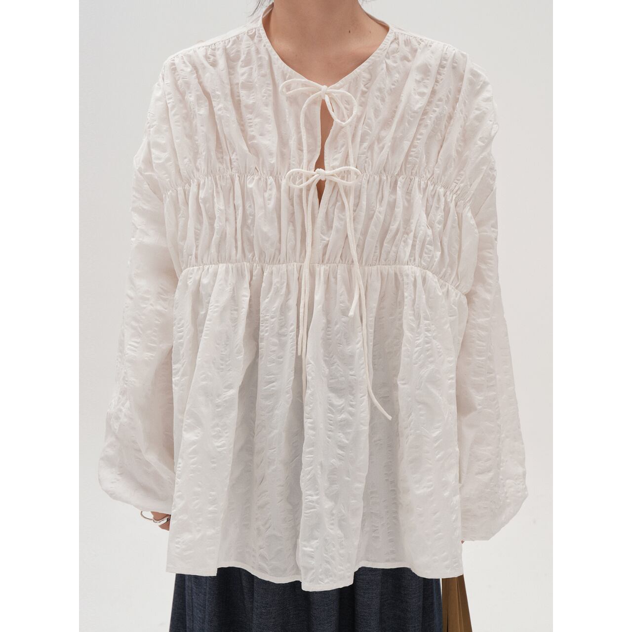 ネックラインのシャーリングと、ウエストのシェイプされたシルエットが女性らしさを演出するブラウス。