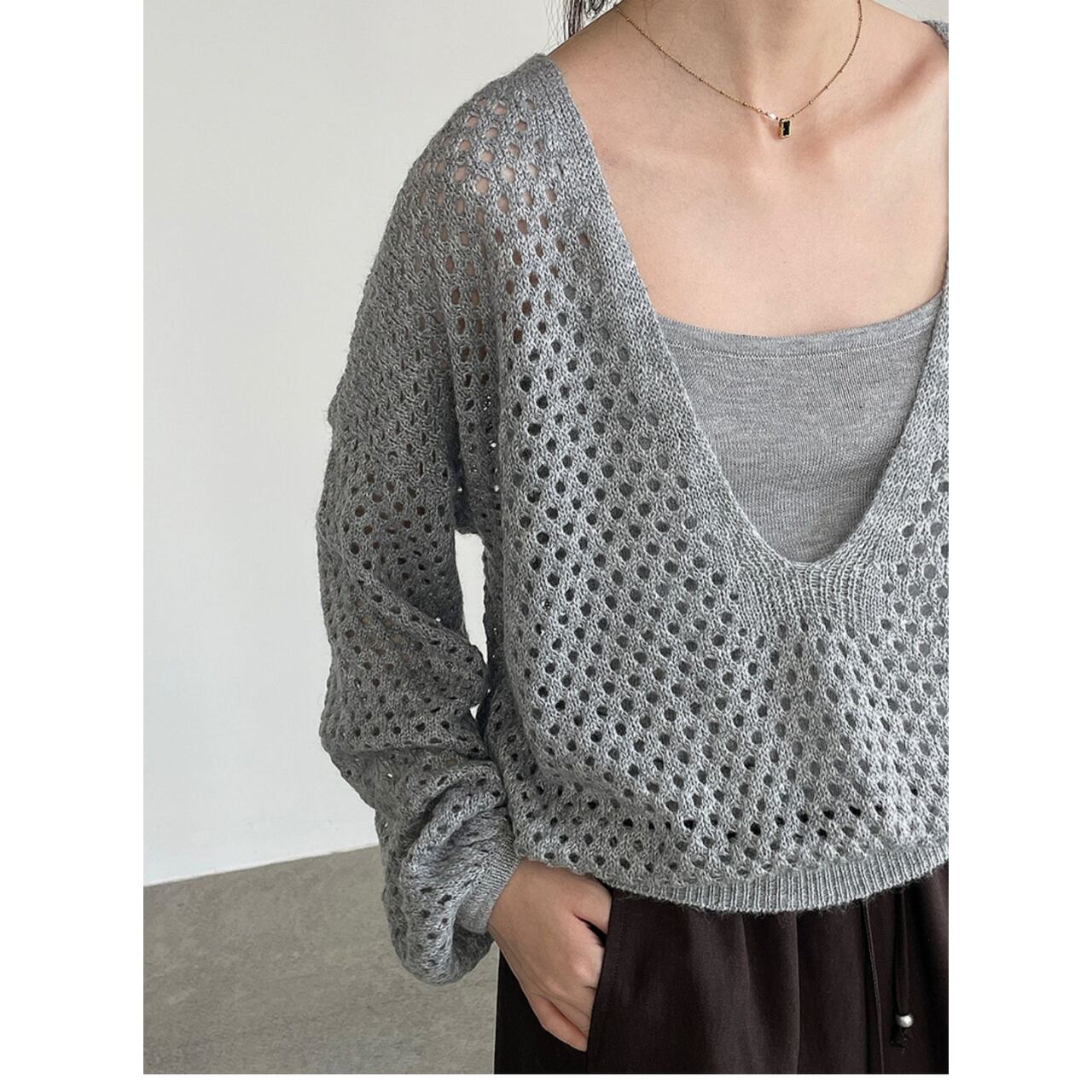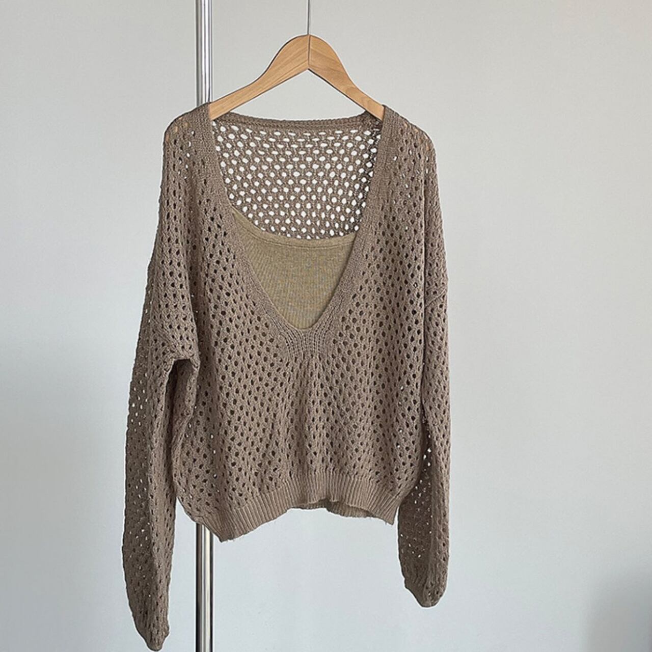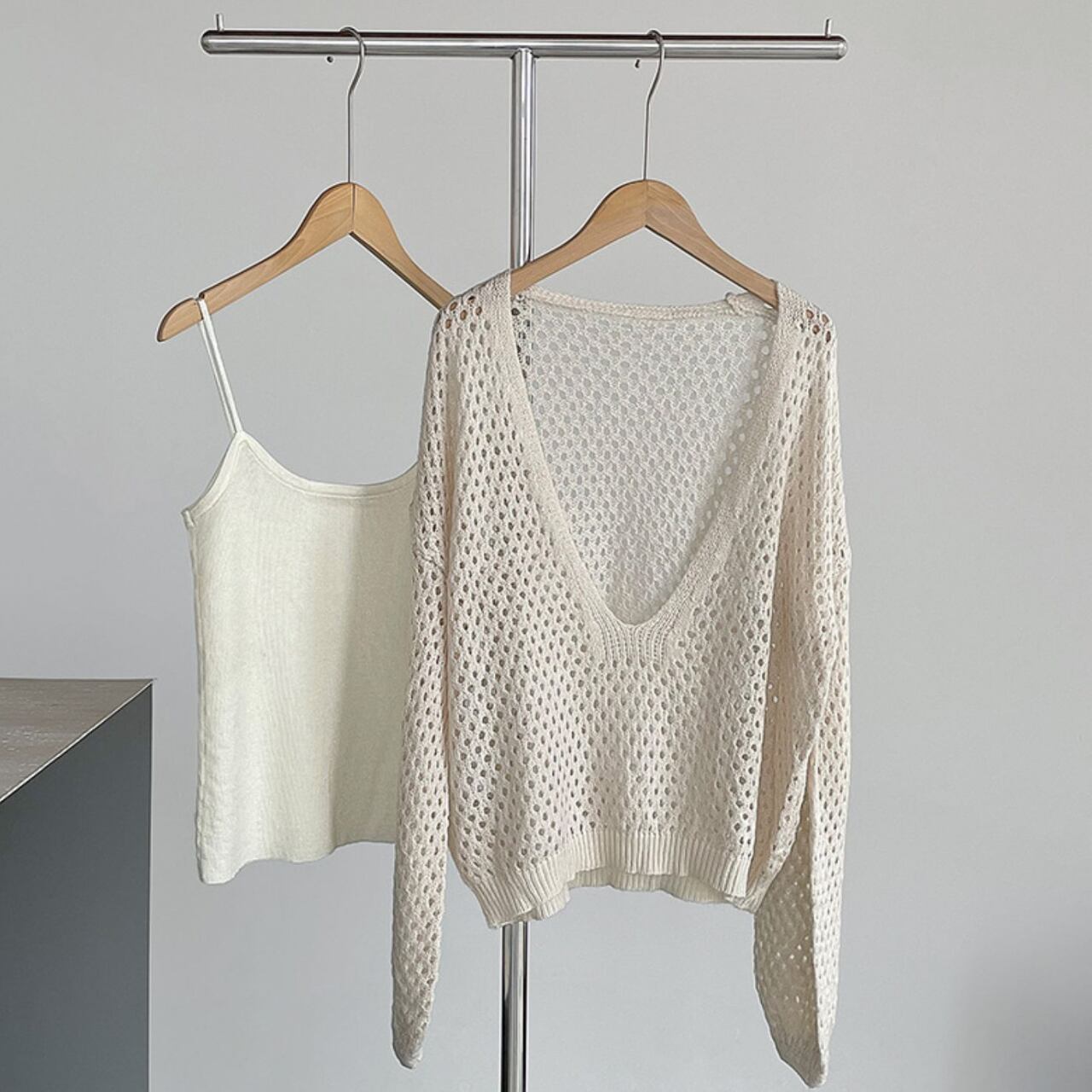 軽やかな印象のメッシュニットプルオーバーと、シンプルなキャミソールのセット。