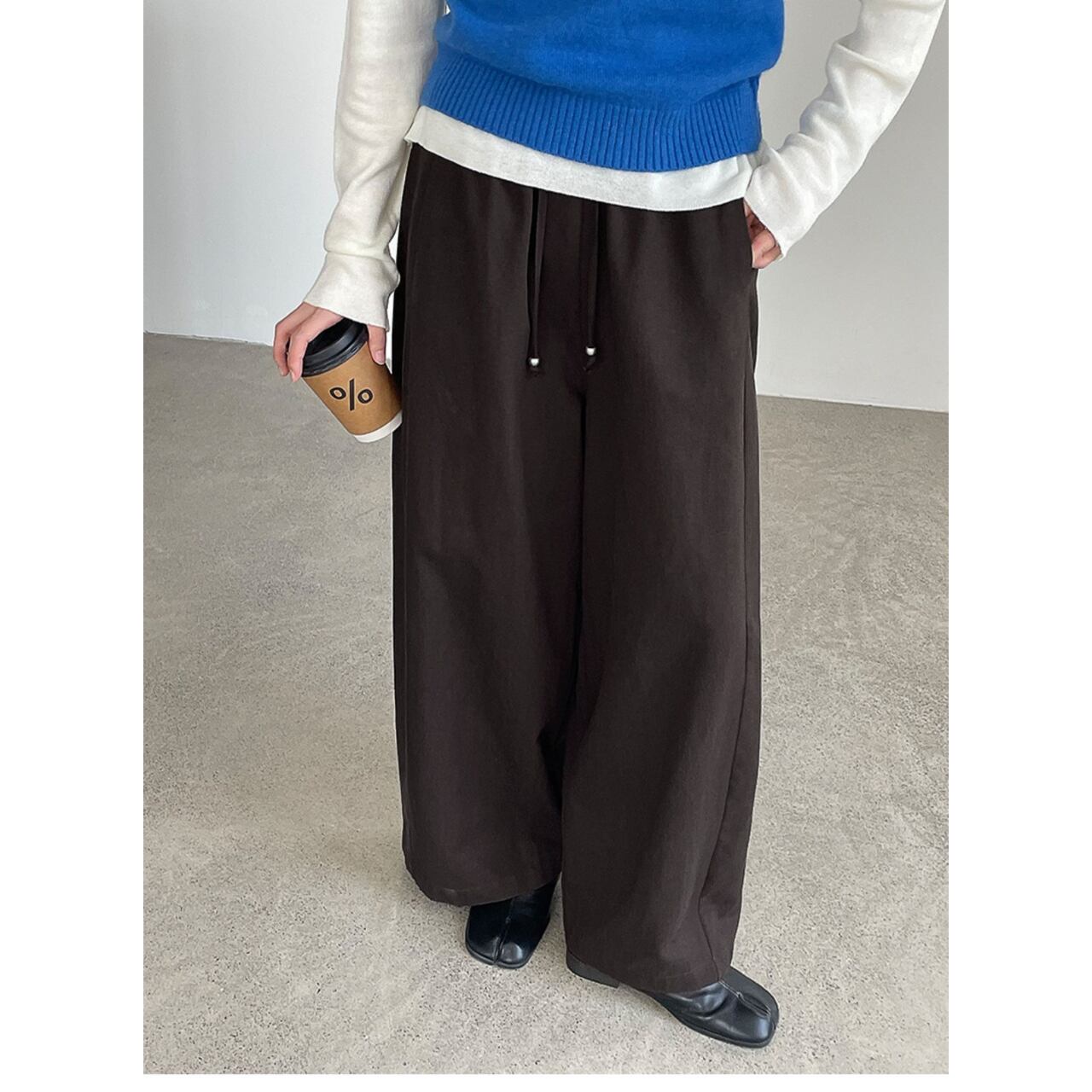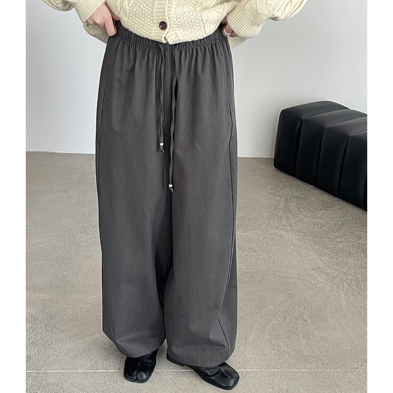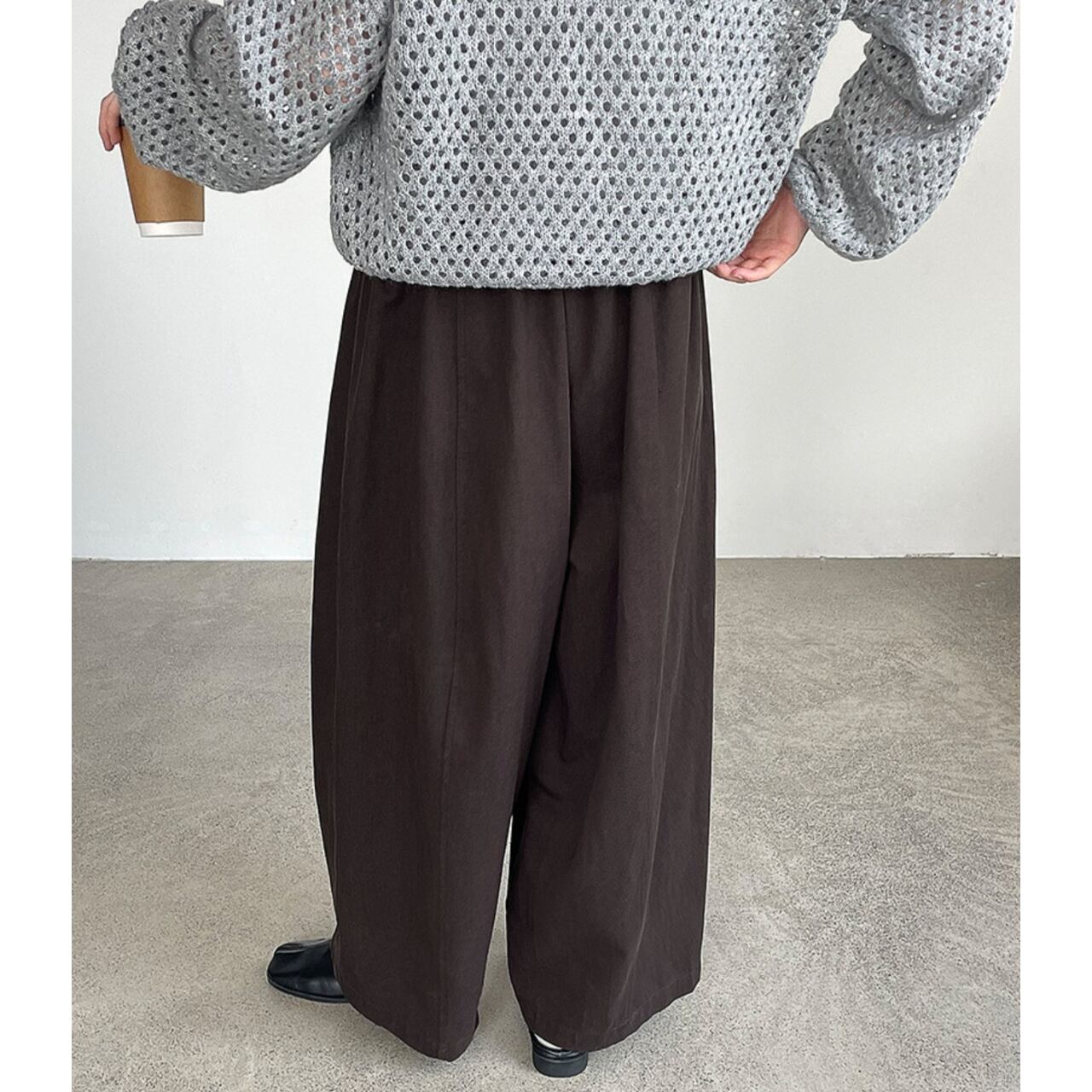 ゆったりとしたワイドレッグシルエットが体型をカバーしつつ、こなれた雰囲気を演出するフルレングスパンツ。