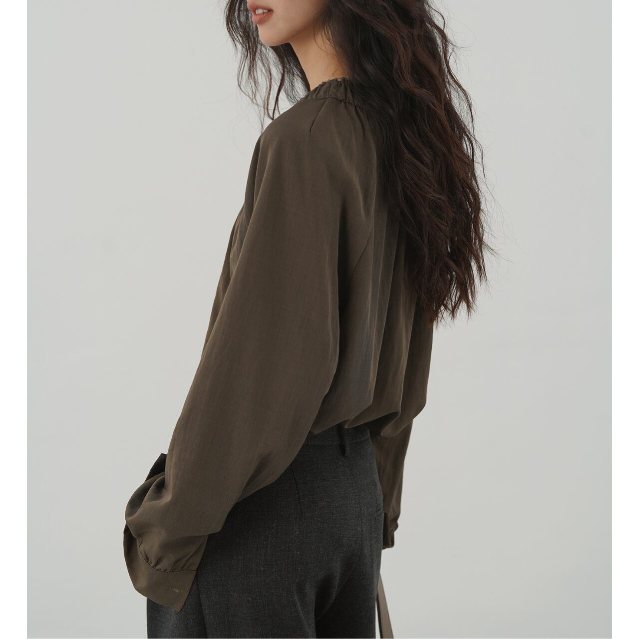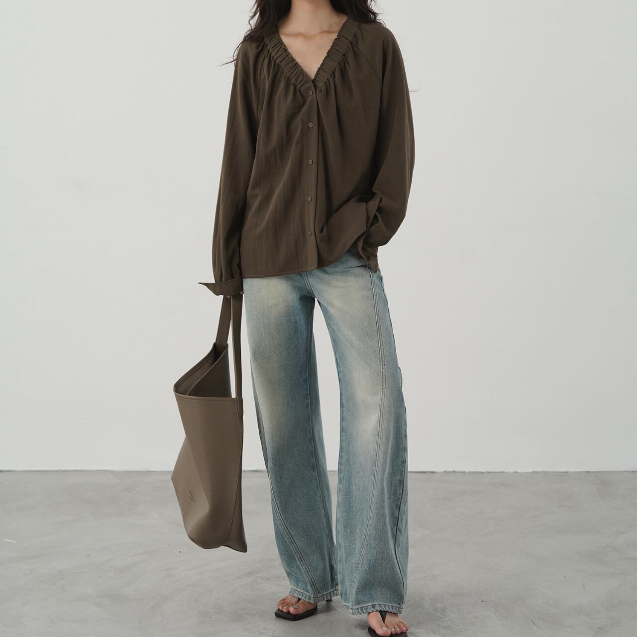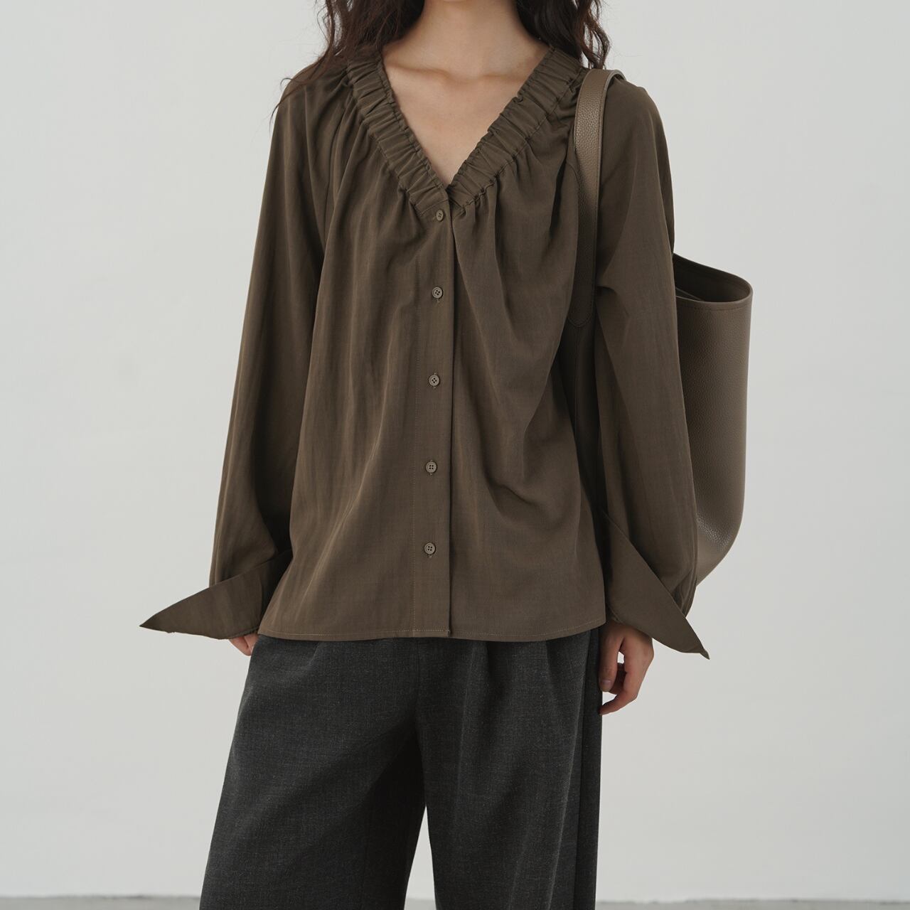 Vネックのギャザーが、女性らしい柔らかな印象を演出するブラウス。