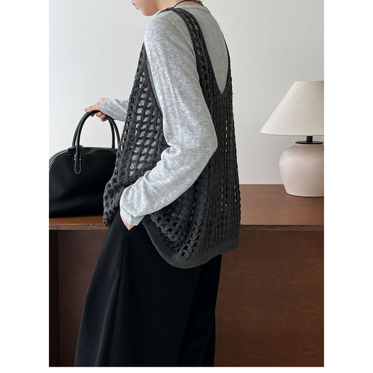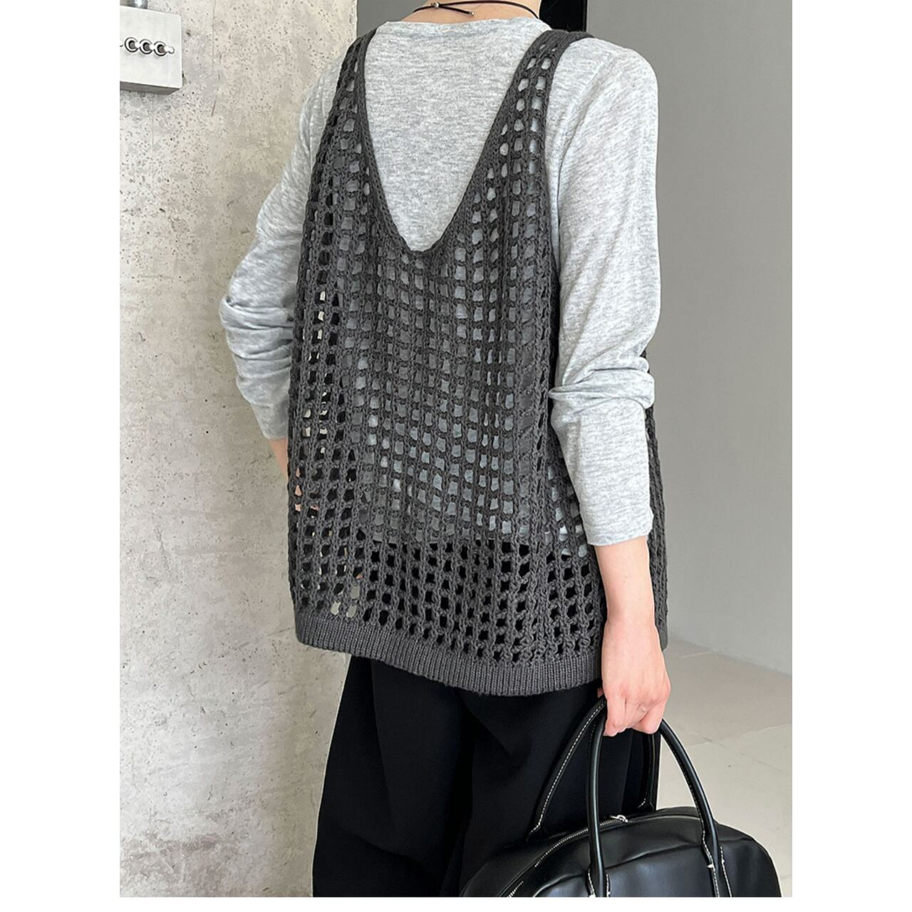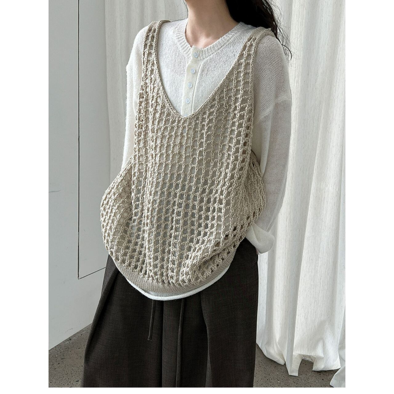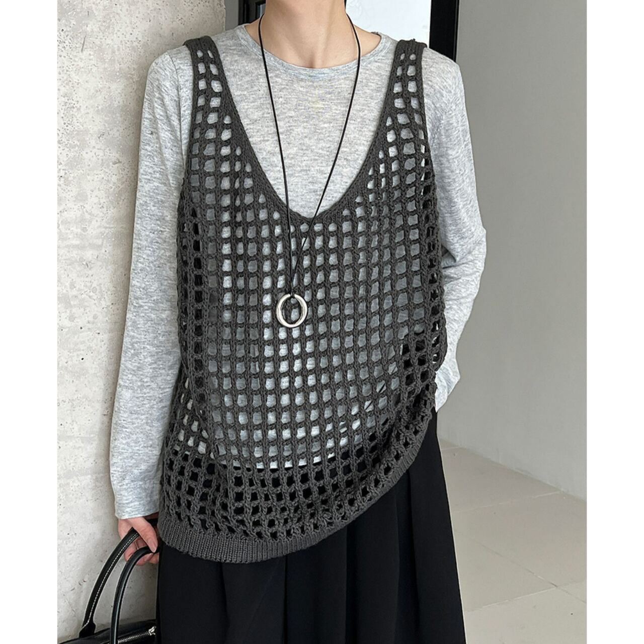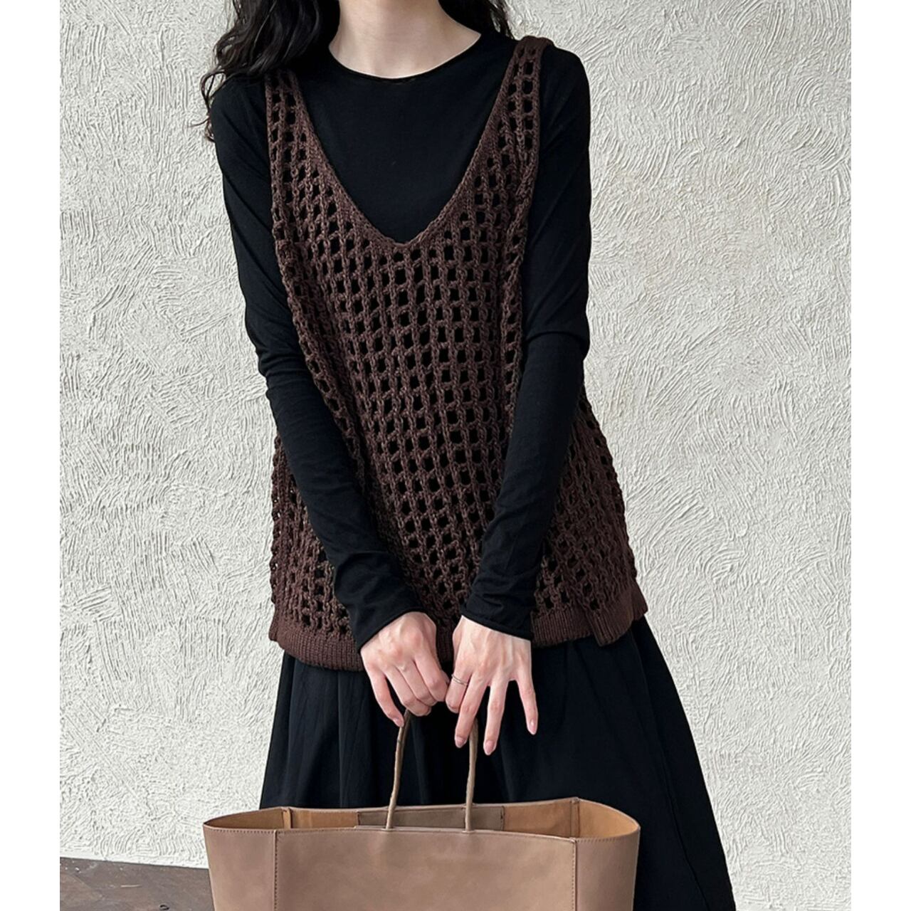 旬なスタイルを演出する、かぎ編みVネックのノースリーブニット。