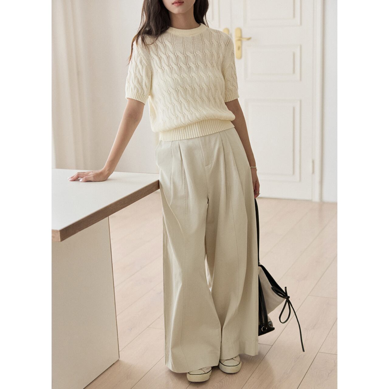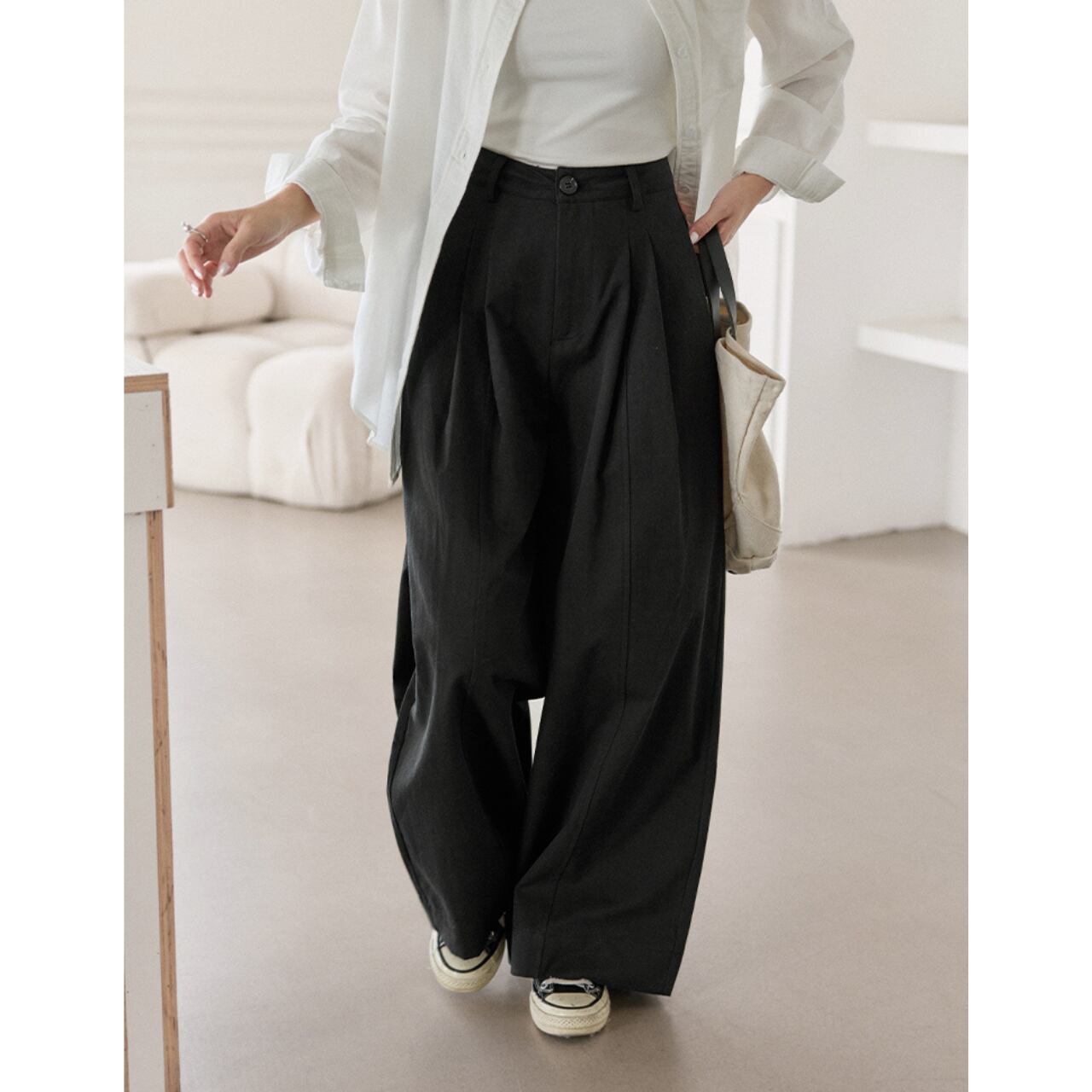 ルーズなシルエットながらも、上品な雰囲気を演出するパンツ。