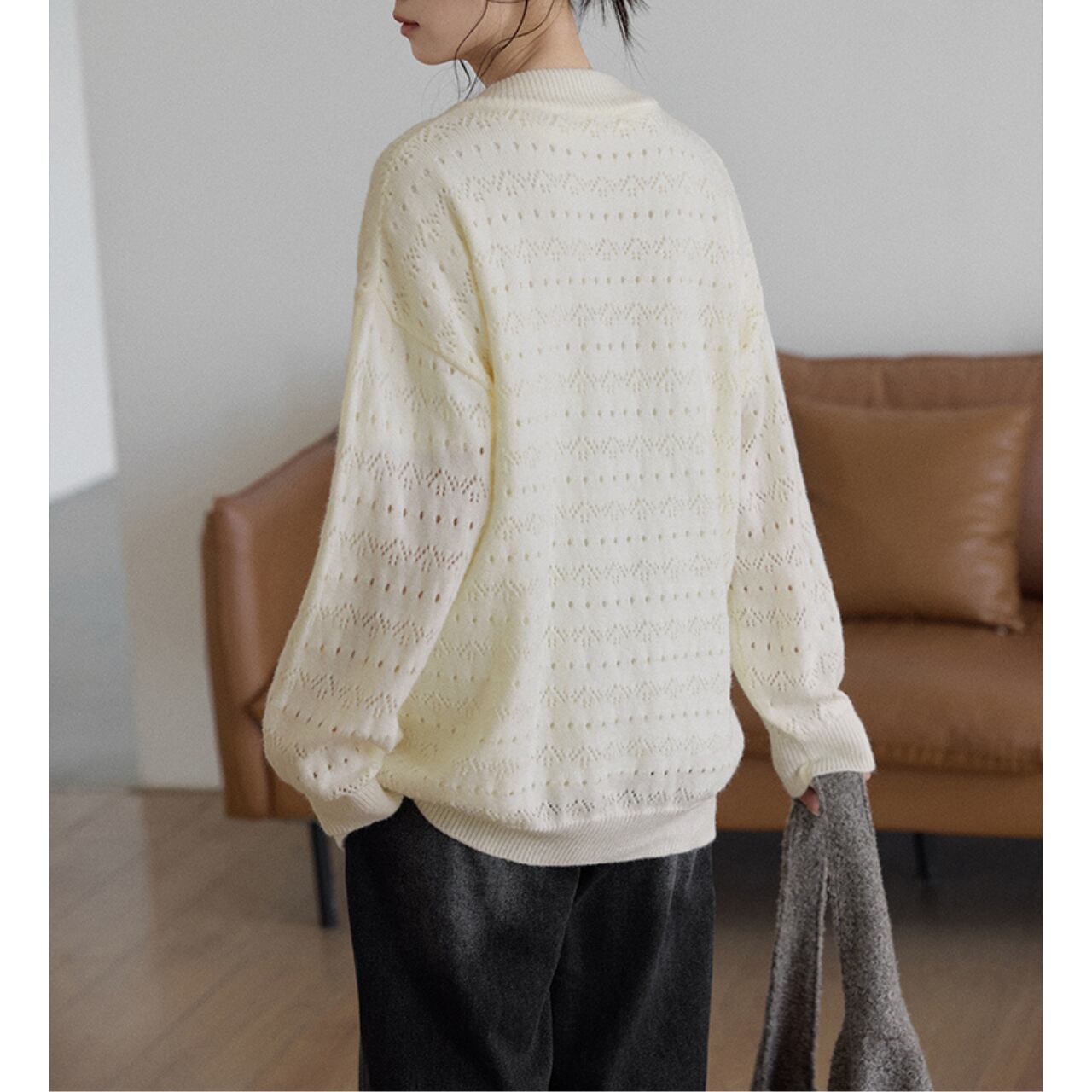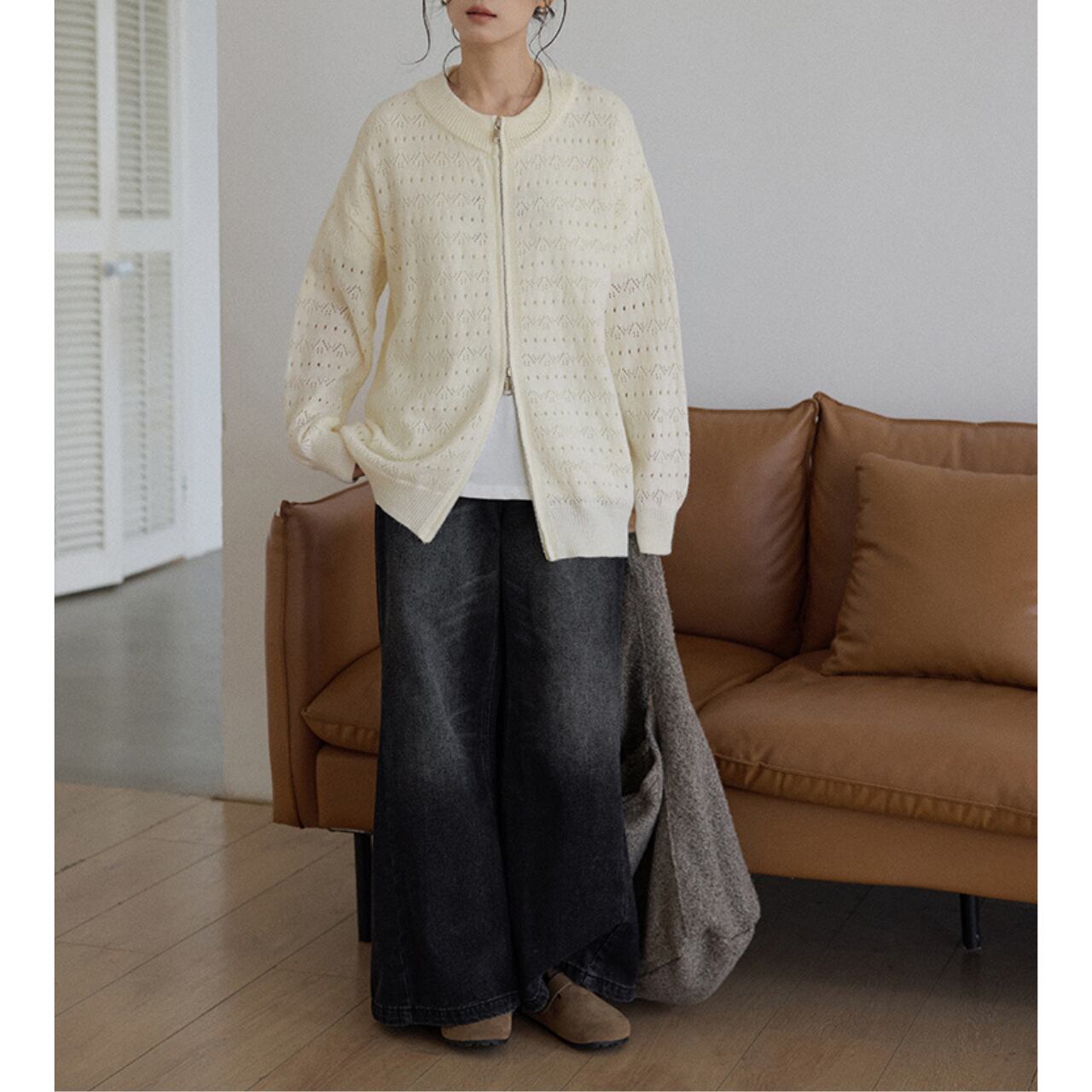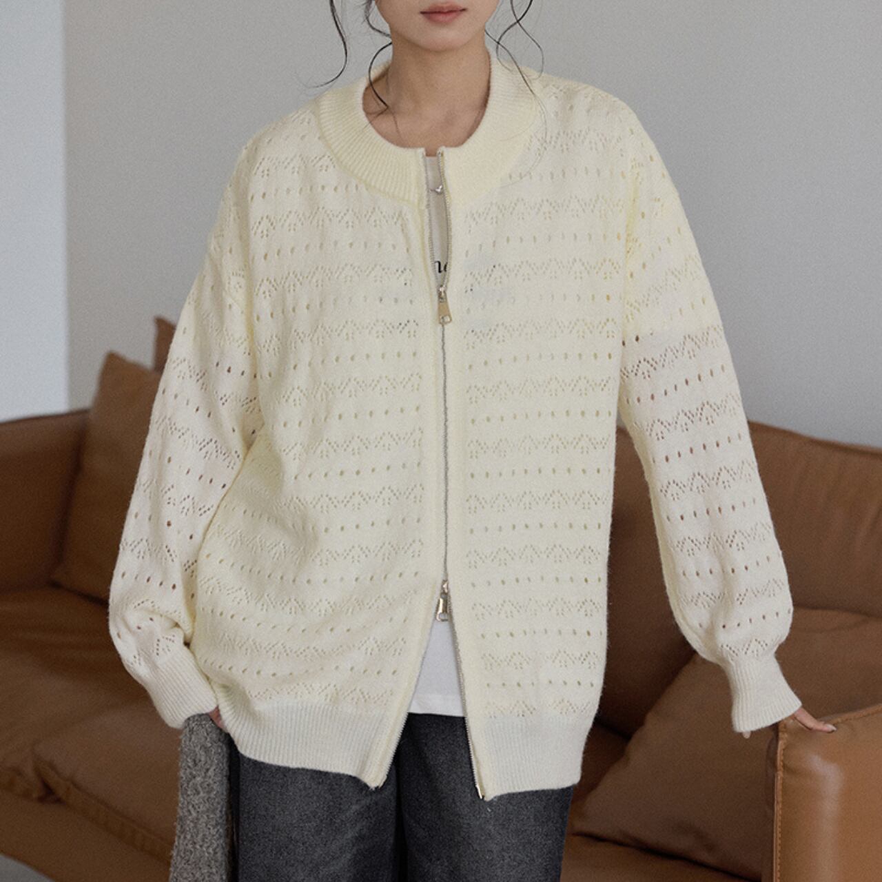 上品な透かし編みが特徴のジップアップニットは、一枚で着映えするアイテム。