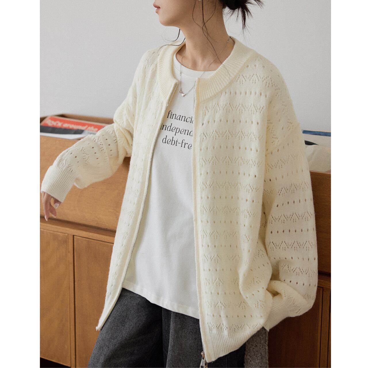 ノーカラー透かし編みジップアップニット a0640